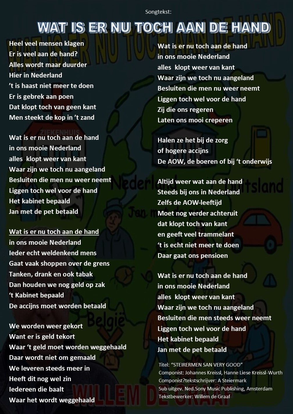 We gaan het afwachten en hopen op mijn gelijk. De muziek voor deze meezinger is gecomponeerd door mijn vriend William W Wiegman en uitgevoerd door Wil Peters. Waarvoor dank.