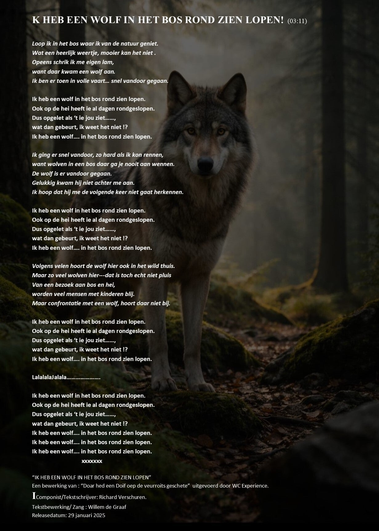De liedtekst van deze single gaat over de vele wolven die momenteel in Nederland verblijven en de problemen die daar mee gepaard gaan. Dit nummer is een bewerking van: "Doar hed een Doif oep mijn veurroits gescheten" Een hilarisch nummer van de Brabantse band: WC Experience" componist/tekstschrijver: Richard Verschuren. Deze single is te beluisteren en downloaden bij alle streamingsdiensten